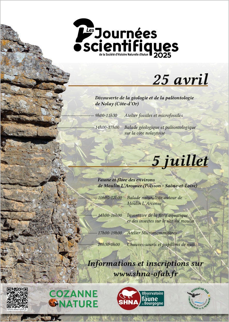 Les Journées Scientifiques 2025 de la SHNA-OFAB se dérouleront le vendredi 25 avril à Nolay et le samedi 5 juillet à Poisson.
