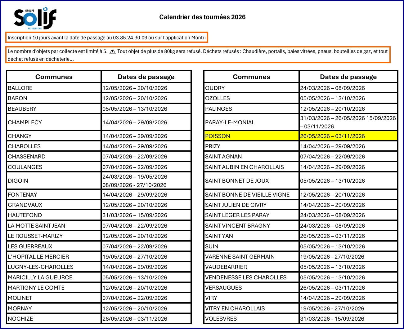 Mardi 26 mai 2026 : ramassage des objets encombrants sur la commune de Poisson.