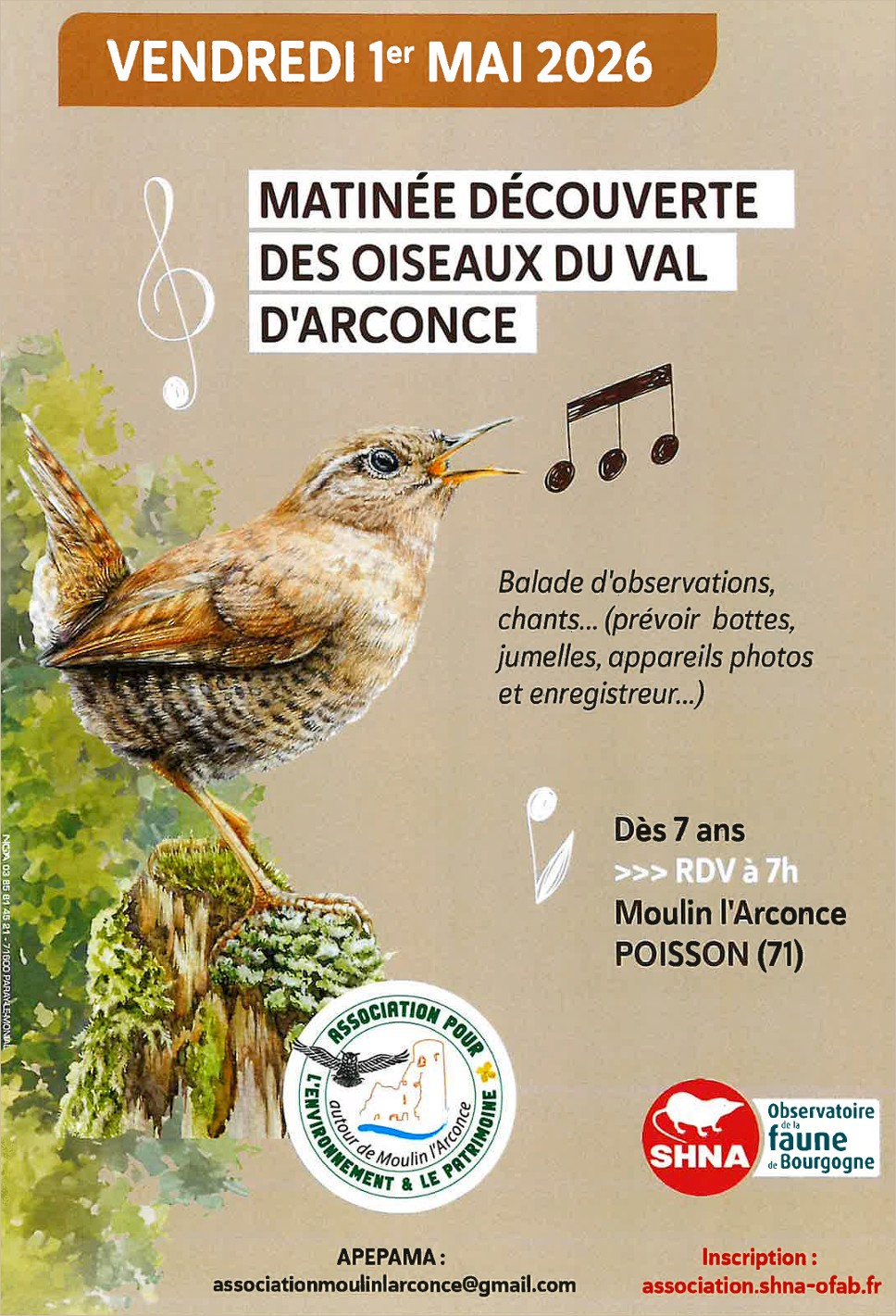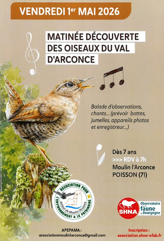 Vendredi 1er mai, à Moulin l’Arconce, dès 7 h du matin avec la SHNA (Société d’Histoire Naturelle d’Autun), matinée découverte des oiseaux du Val d’Arconce.