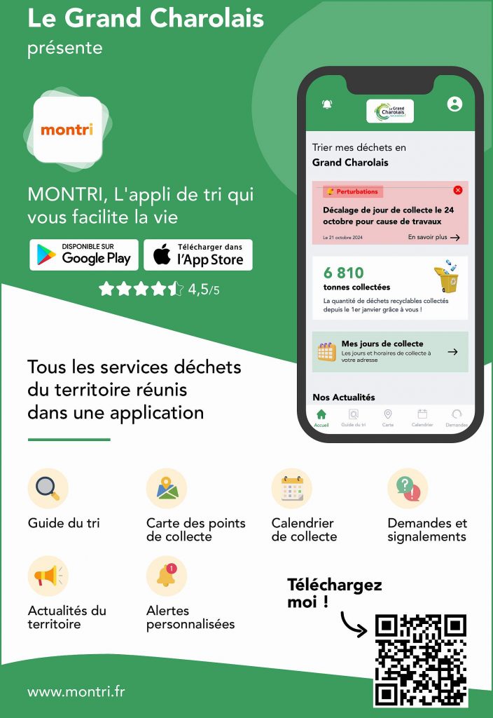 Le Grand Charolais vous accompagne dans votre gestion des déchets avec l’application Montri. Cette application permet d’accéder à différentes informations : guide de tri,dates des collectes, …