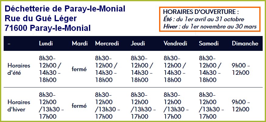 Pour connaitre les heures d’ouverture des déchetteries de Digoin, Palinges, Saint-Bonnet-de-Joux, Vendenesse-les-Charolles : cliquez ici (site internet de la Communauté de communes Le Grand Charolais)